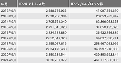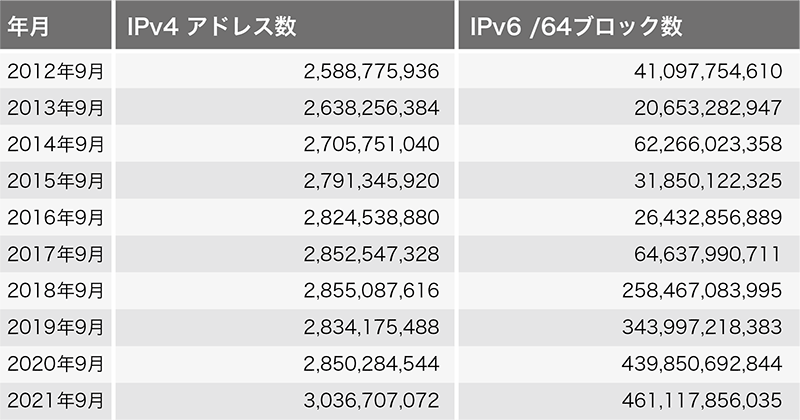最後に「IPv4/IPv6フルルート」広報元AS(Origin AS)数を確認します(表-4)。なおこの1年の間にAPNICに6144、ARINに2048の32-bit only AS番号が追加割り振りされています。