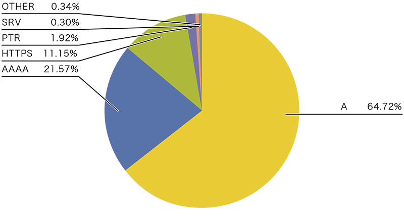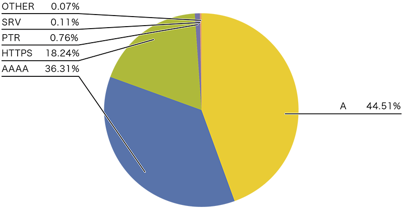 問い合わせレコードタイプに注目すると、ホスト名に対応するIPv4アドレスを問い合わせるAレコードとIPv6アドレスを問い合わせるAAAAレコードが全体の約8割を占めています。AとAAAAの問い合わせ傾向は通信に利用されるIPプロトコルで違いが見られ、IPv6での問い合わせではより多くのAAAAレコード問い合わせが見られます。IPv4での問い合わせでは、全体の64%程度がAレコード問い合わせ、21%程度がAAAAレコード問い合わせです(図-1)。一方IPv6での問い合わせでは、全体の44%程度がAレコード問い合わせ、36%程度がAAAAレコード問い合わせとAAAAレコード問い合わせの比率が高まっています(図-2)。昨年と比べるとIPv4で-15ポイント、 IPv6で-7ポイント程度Aレコードの問い合わせが減少しています。昨年から観測され始めたHTTPSタイプのDNS問い合わせがIPv4で11%、IPv6で18%程度を占めており、昨年と比べるとIPv4で+9ポイント、IPv6では+12ポイントと大きな伸びを示しています。HTTPSレコードの問い合わせ傾向はAAAAレコードと相関があるように見え、すべての時間帯でHTTPレコードの問い合わせはAAAAレコードの問い合わせの約半数となる傾向が見えています。