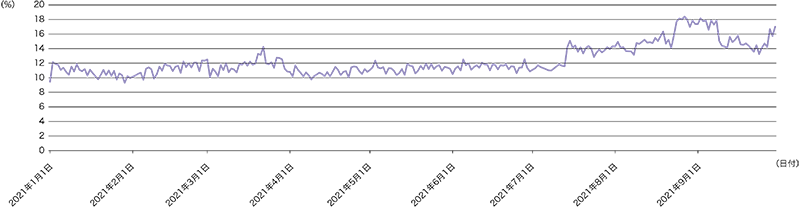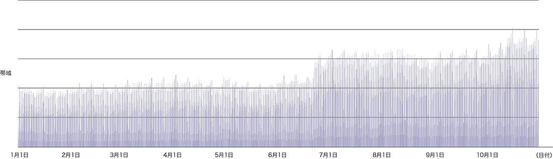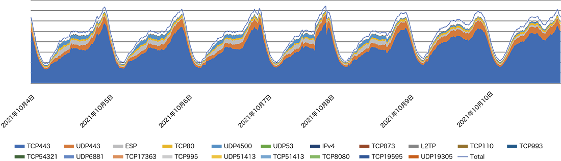 IIJのコアPOP(東京3ヵ所、大阪2ヵ所、名古屋2ヵ所)のバックボーンルータで計測したトラフィックを図-3に示します。なお、今回はシステムの都合上、1年分のデータではなく、2021年初頭から9月30日までの9ヵ月間のデータとなっています。