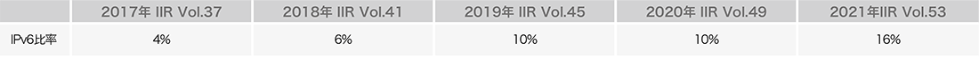 全体に占めるIPv6比率を図-5に示します。IPv6トラフィックは年々増加を続けていますが、まだIPv4と比べると絶対的な量としては大分少ない状況です。ただ、この報告が始まった2017年は地を這うようなトラフィックグラフだったことを考えると、4年で随分と伸びてきているとも思います。今回このレポートは5回目になりますので、1回目からのIPv6/IPv4比率を表-5にまとめてみます。