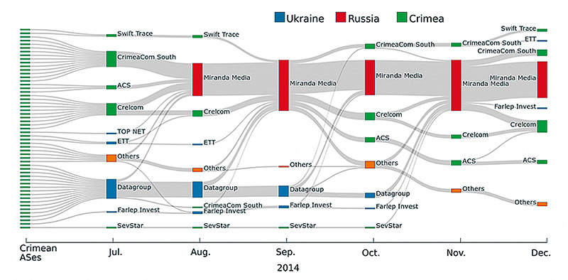 Miranda Mediaの登場は、ロシアがクリミアとの接続性を強化する明確な第一歩です。図-1に示すように、クリミアの複数のASは、2014年に利用可能になるとすぐにMiranda Mediaに切り替えています。どのように移行していったかを理解するために、2014年7月から12月までのクリミアの主なASのネットワーク依存性について詳細に調査しました。