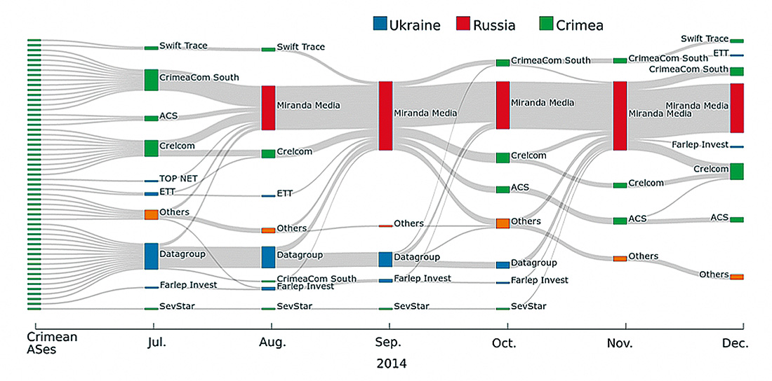 紛争地域としてのクリミアの地理的な状況と、米国及びEUからの制裁の結果、クリミア及びルハンスクとドネツクでは、インターネットサービスはグレーマーケットでした。ネットワークの経路が段階的に集約されインターネットサービス市場が独占されたことで、ネットワークが容易に支配できるようになりました。その結果、インターネット接続の品質と速度が低下し、エンドユーザのインターネットサービスの価格は上昇しました。