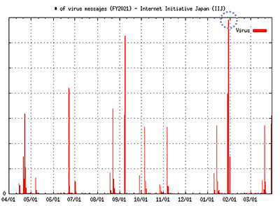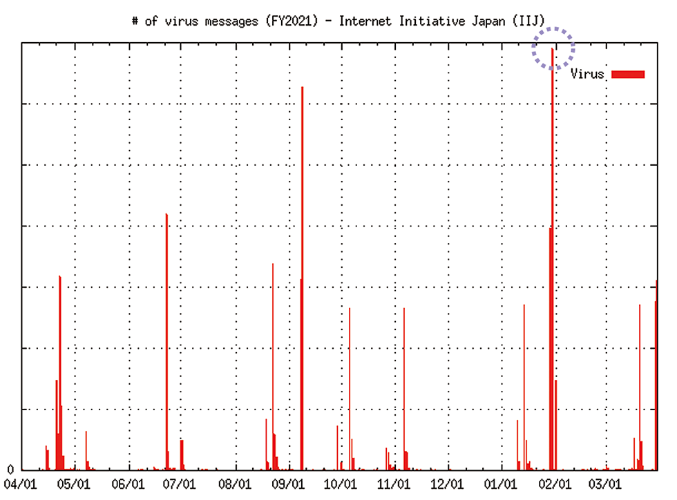 昨年6月に発行した本レポートのVol.51(https://www.iij.ad.jp/dev/report/iir/051/01.html)の「定期観測レポート」で、迷惑メールと、ウイルス数の集計と傾向を報告しました。特徴的だったのは、最大値でその前年度の200倍もの迷惑メールを受信したことと、Emotet(エモテット)と呼ばれるウイルスが自分自身をZIPで暗号化することでウイルススキャンを回避し、猛威をふるっていたことでした。