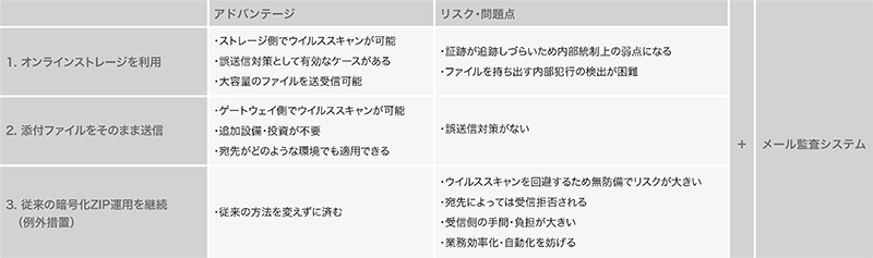 3つ目は、従来の暗号化ZIP運用を続ける方法です。これは例外措置です。メールでのやり取りは、送信・受信の双方あって成立するものですから、一部の組織や取引先様で従来の手法を取らざるを得ないケースが残っています。このような場合は、リスクを十分に理解した上で、その組織長の承認によって、例外措置を入れた運用をしています。