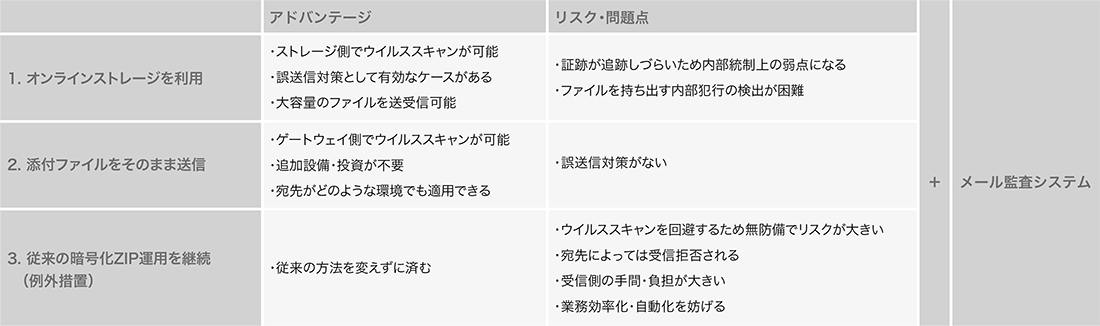 1つ目は、全社統一のオンラインストレージです。代替策として論じられている、最もオーソドックスな手段でしょう。ただし、オンラインストレージにはメールをアーカイブしているときに、後からファイルの追跡がしにくいという内部統制上の弱点になり得る点や、URL1つで大容量のファイルを持ち出すことができてしまうため内部犯行を見つけ出すのが困難である点をリスクとして抱えています。