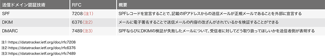 IIJのDMARC導入について報告する前に、改めて送信ドメイン認証技術について以下に記します。送信ドメイン認証技術にはSPF、DKIM、DMARCが世界的に一般に使用されており、それぞれRFCにて定義されています(表-2)。