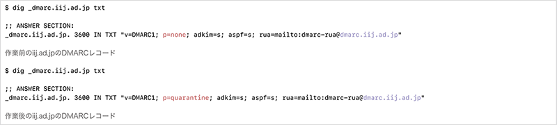 図-3 作業前と作業後のiij.ad.jpのDMARCレコード