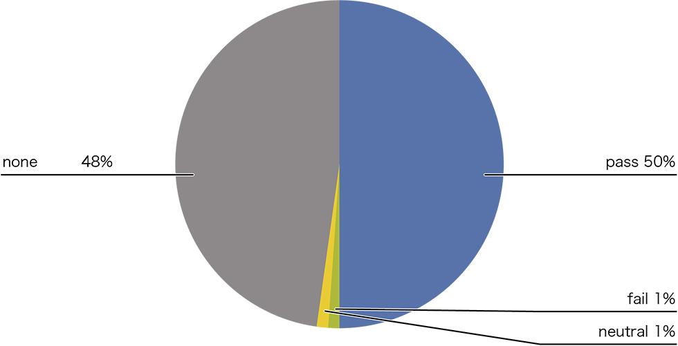 前回、本レポートのVol.51(https://www.iij.ad.jp/dev/report/iir/051/01.html)で報告した集計結果と比較すると、DKIMとDMARCのpass割合が増えていることが分かります。DKIMのpass割合が前回と比較して数ポイント増加していることから、リモートワークの状況下にて各企業でのSaaS導入がやや増加傾向にあるのではないかという予測ができます。また、DMARCのpass割合も増加していることから、徐々にではありますが、送信ドメイン認証への世間への関心が高まっている様子が窺えました。