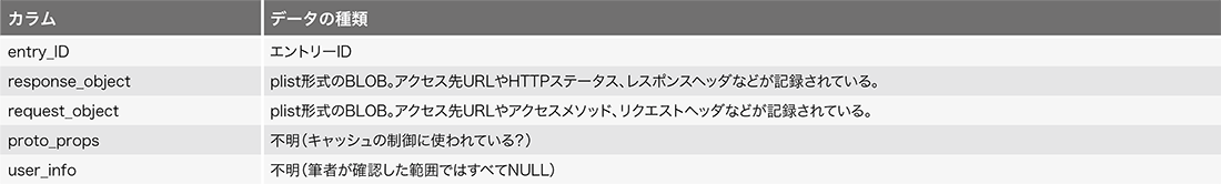 まず、Cache.dbに記録されている情報を確認します。Cache. dbにはNSURLRequstなどのAPIを使用したHTTP/HTTPS通信のデータがキャッシュとして保存されています。Cache. dbファイルはSQLite形式のデータベースで、表-1~表-5に示すテーブルにデータが保存されています。キャッシュデータは基本的に、このデータベースに保存されますが、一定以上のサイズのデータはfsCacheDataディレクトリ以下にファイルとして保存されます(図-1)。テーブル名が「cfurl_ cache」で始まっていることから、「CFURL Cache」と呼ばれているようです。