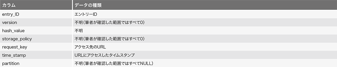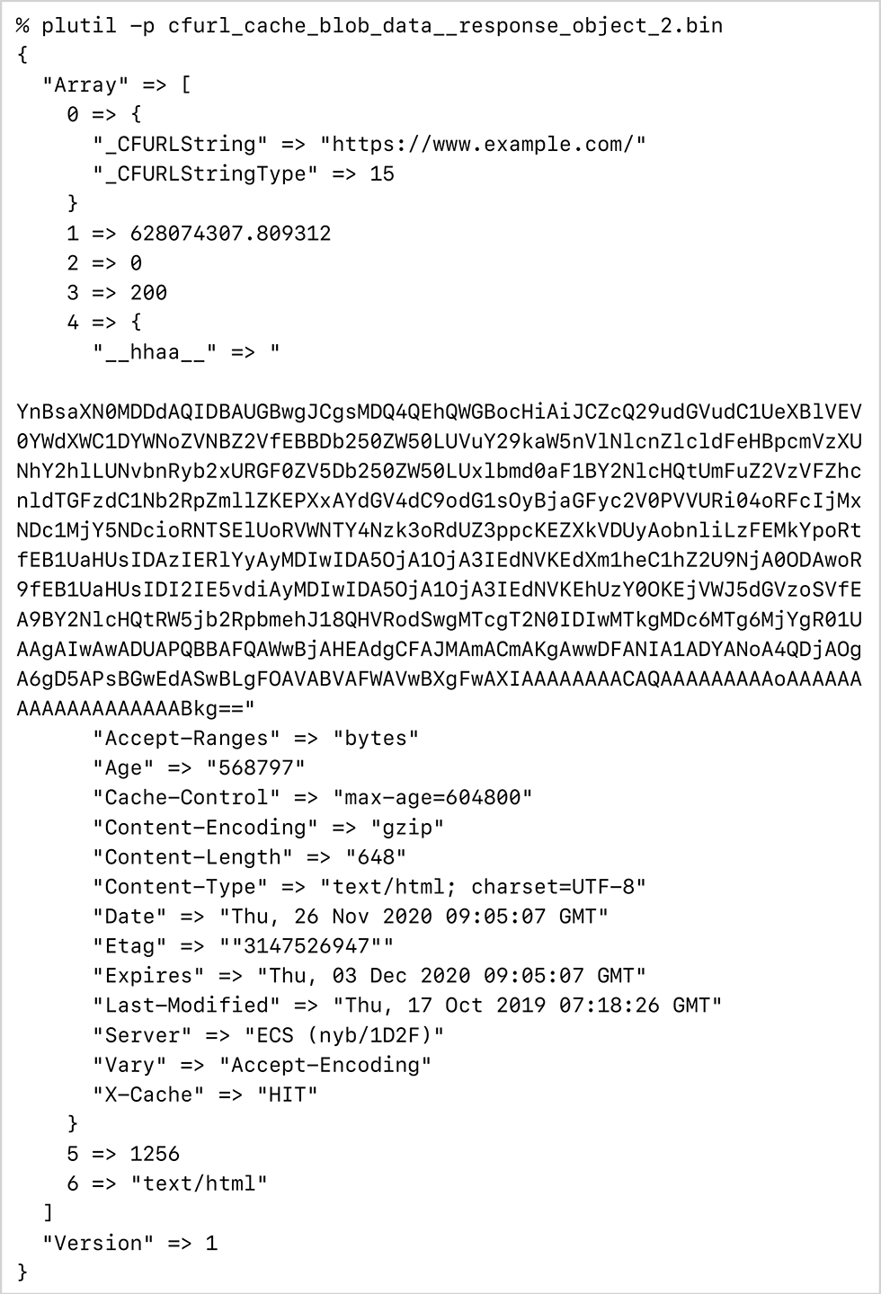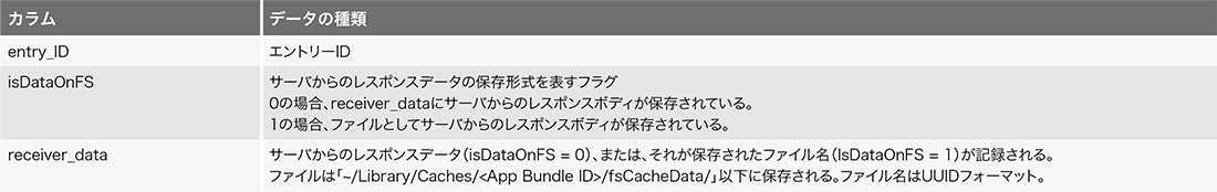 cfurl_cache_receiver_dataテーブル(表-2)のreceiver_ dataにはサーバからのレスポンスボディが保存されています。この情報もフォレンジック解析に有用であるため、解析結果に保存します。ただし、fsCacheDataディレクトリ以下にファイルとして保存されているデータは解析結果に含めるのではなく、ファイルのエクスポートをするのが良いでしょう。これにより、必要以上に解析結果のファイルサイズを大きくさせずに済みます。
