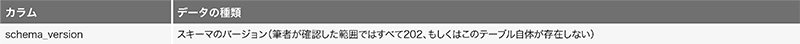 最初にテーブル名のリストを取得し、cfurl_cache_schema_ versionテーブルがある場合、スキーマバージョンを取得します(118 ~121行目)。筆者が確認した範囲ではバージョンは「202」しか確認できませんでした(注7)。
