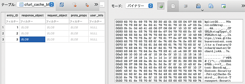 ところで、cfurl_cache_blob_dataテーブル(表-1)のresponse_ objectとrequest_objectはplist形式のBLOB(図-2)が保存されています(注2)。このデータはplist形式のまま解析結果として保存するのでなく、解析者が内容を把握しやすいようにパースした結果を保存すべきです。