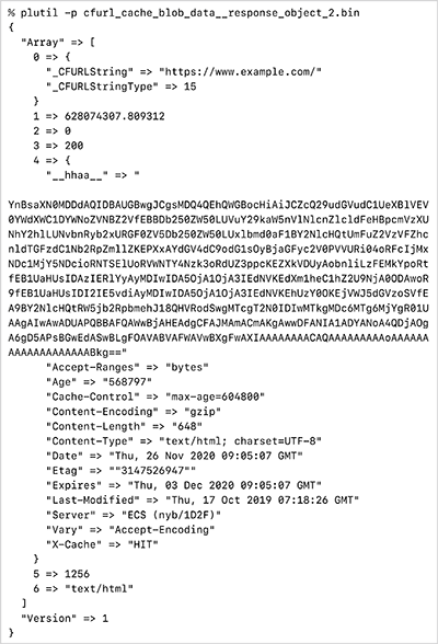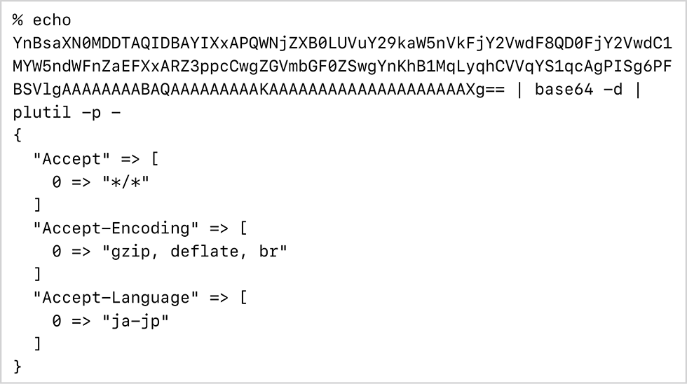 DB Browser for SQLite(注3)などでrequest_objectのデータをエクスポートして、macOS標準コマンドのplutilで確認すると図-3のようになります。この中でフォレンジック解析に必要そうなデータは、「Array」の18番目と19番目のデータです。18番目はHTTPリクエストメソッドで、19番目はHTTPリクエストヘッダです。