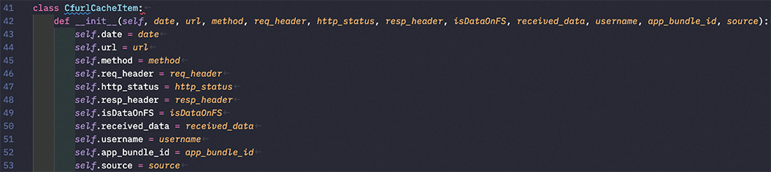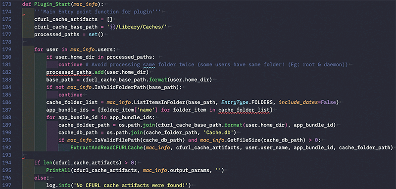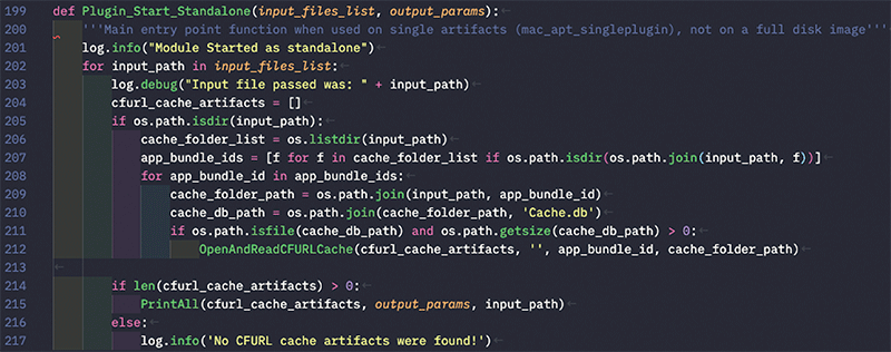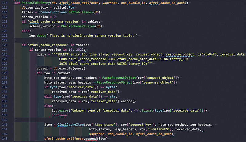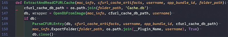 その後、IsValidFilePath()メソッドで各ディレクトリ以下のCache.dbファイルの存在を確認します(191行目)。存在する場合、ExtractAndReadCFURLCache()関数を呼び出し、Cache.dbの解析結果の取得及びアーティファクトファイルのエクスポートを行います(192行目)。解析結果はcfurl_ cache_artifactsにlistオブジェクトとして保存されます。