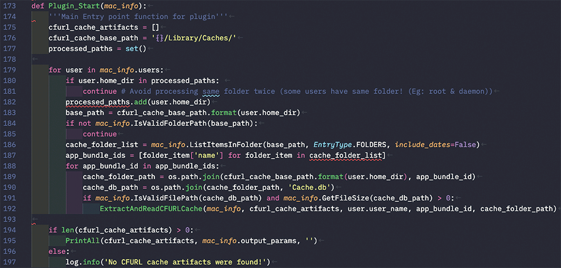 「mac_info.users」はディスクイメージ内のユーザ情報がlistオブジェクトで保存されています。これを利用して、全ユーザのアーティファクトを処理することができます(179行目)。ただし、複数のアカウントに同じホームディレクトリが設定されている場合があるため、一度処理したホームディレクトリはスキップします(180 ~182行目)。