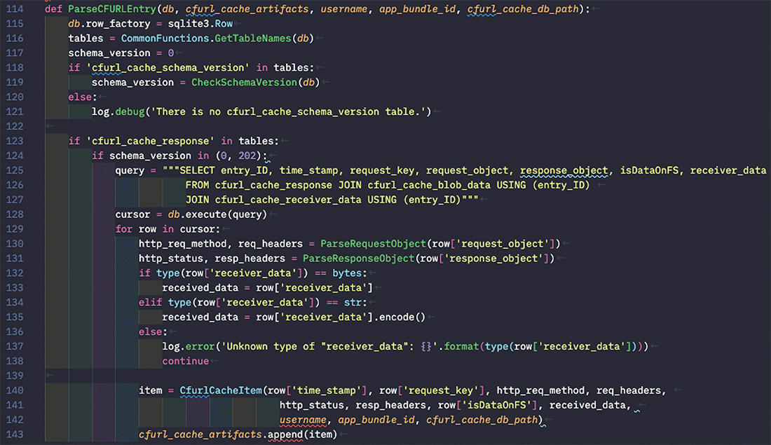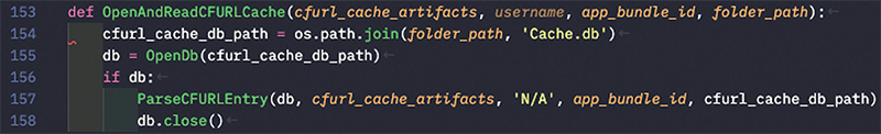 Cache.dbはOpenDb()関数内でオープンします。この関数では、mac_aptのCommonFunctionsクラスのopen_ sqlite_db_readonly()メソッドでコネクションを取得します。データ解析は上述したようにParseCFURLEntry()関数で行います。