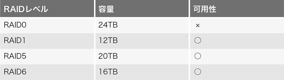 ここまでRAIDを説明してきましたが、それぞれのRAIDの例として、4TB HDD 6本(スペアドライブなし)で構成した場合、使用できる容量と可用性について表にまとめてみました(表-1)。