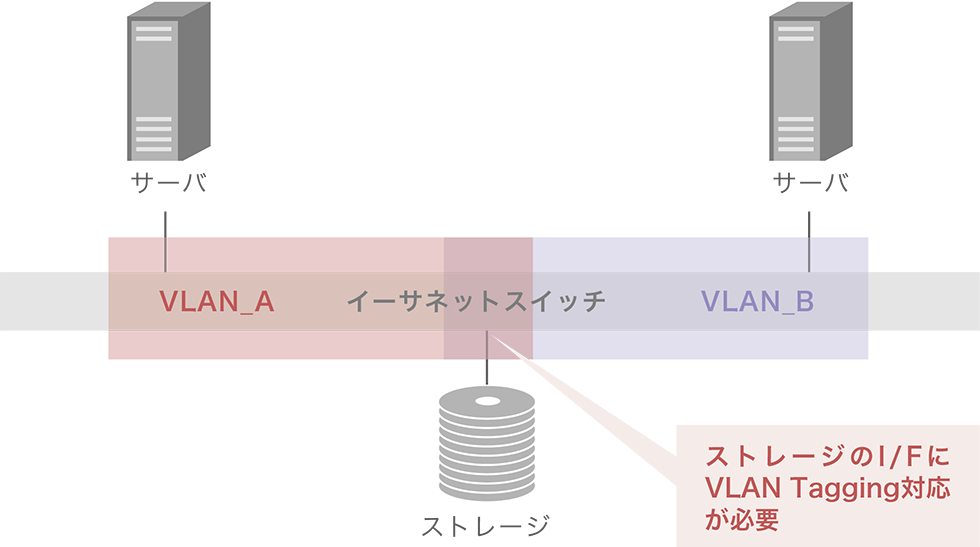 現在販売されているストレージアレイシステムで、VLAN Taggingをサポートしている製品が豊富かというと、NAS製品については多数存在していますが、iSCSIなどIP-SAN向けの製品はごく少数しか存在しておらず、対応していてもVLAN数に制約があり、多数のシステムの収容が困難である場合が少なくありません。