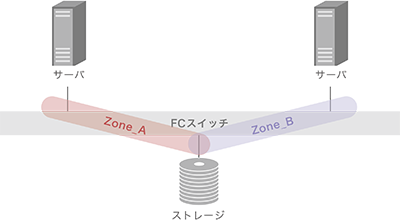 次にFCについて説明すると、FC-SANを流れるプロトコルはイーサネットで使うプロトコルではなくストレージに特化されたプロトコルのみで、FC-SANの目線で見ると各サーバ間のセキュリティは保たれます。また、FCのセキュリティを高める方法として、図-3のようにストレージ(ターゲット)とサーバ(イニシエータ)を紐付けるゾーニングという機能を用いて、他システムが利用するストレージへのアクセスを遮断する方式を取っています。またイーサネットとは異なり、複数システムで単一のストレージを共有する場合は図-4のようにそれぞれのゾーニングを設定すれば良いだけなので、アレイシステムの選択に苦慮しません。他にFC-SANを使うと、サーバとストレージの間のIPアドレス設計が不要になることでしょうか。