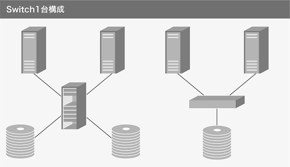 まずはスイッチ1台で構成した場合の構成です。小規模からスタートできるので、まずはこの構成をIIJでも採用していました。この構成の欠点は、サーバやストレージが増えてくると拡張が難しくなり、拡張しようにも大規模なメンテナンスを余儀なくされてしまうことです。