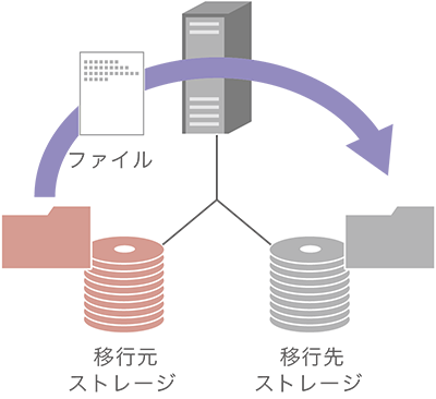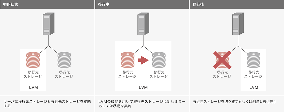 ただし、もともと論理ボリュームマネージャを使用していない環境では、この方法を用いることはできないため、そのような環境では前述のファイル単位の移行を行うほかに、後述するストレージの移行機能を用いるしかありません。