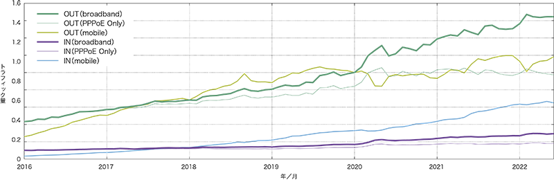 このように、ブロードバンドはPPPoE、IPoE共に全体の分布はほとんど変わっていません。一方で、PPPoEからIPoEへの移行が進んで、IPoE割合が増えているため、全体のトラフィック量は増えています。