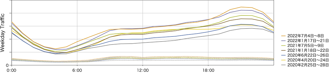 2020年の2月と4月を比較して最初の緊急事態宣言の影響を見ると、昼間のトラフィックが大きく増えていて、また夜のピーク時間帯でも増加しています。緊急事態宣言が解除された6月には昼間の増加分が半分以下に減少していますが、ピーク時間帯ではほとんど減っていません。直近2年間の変化では、20時~22時のピーク時間帯に着目するとほぼ一貫して増加していることが分かります。一方で、昼間のトラフィックは2021年、2022年共に1月に大きく増えて、7月にはあまり増えていません。これは、両年共に1月後半には感染が拡大していたため在宅時間が多くなっていたのに対し、7月初めには比較的状況が落ち着いていた影響と考えられます。このように、この2年間の推移を見ると、夜のピーク時間帯では堅調な増加となっている一方で、平日昼間の増加は感染状況に伴う在宅率に影響を受けていると言えます。