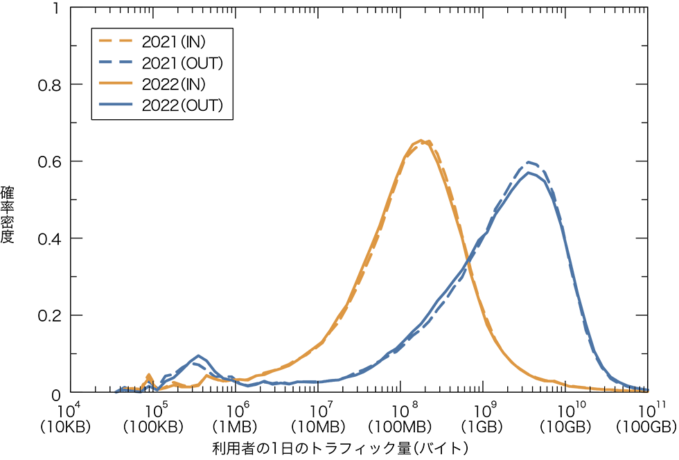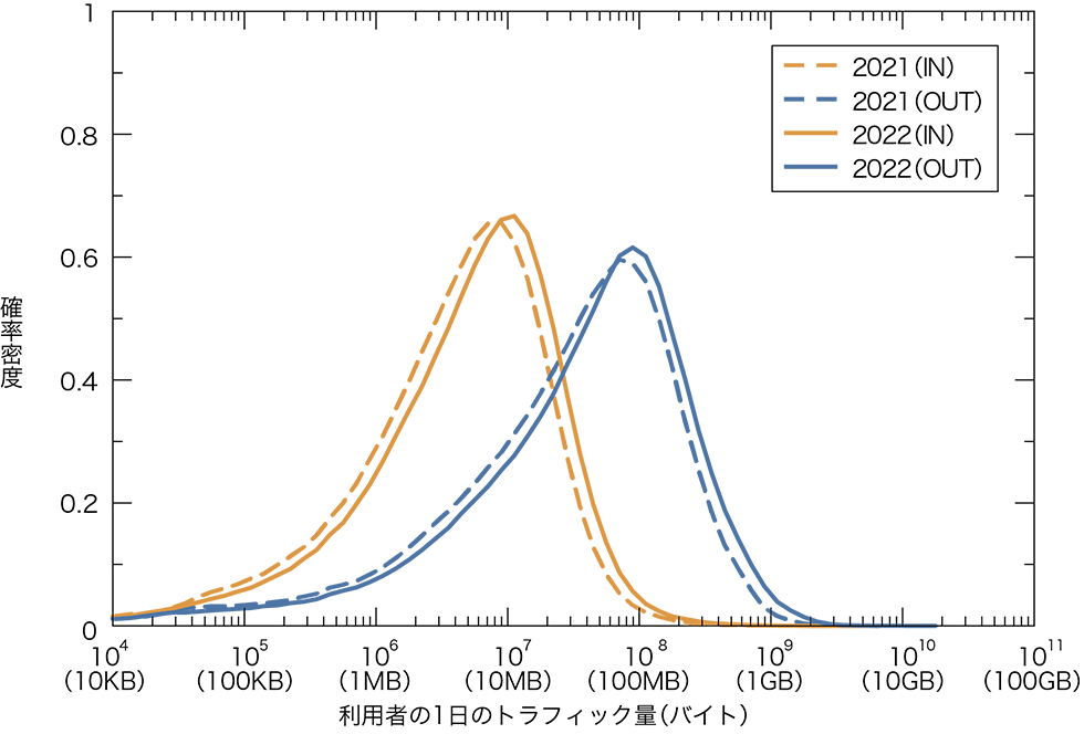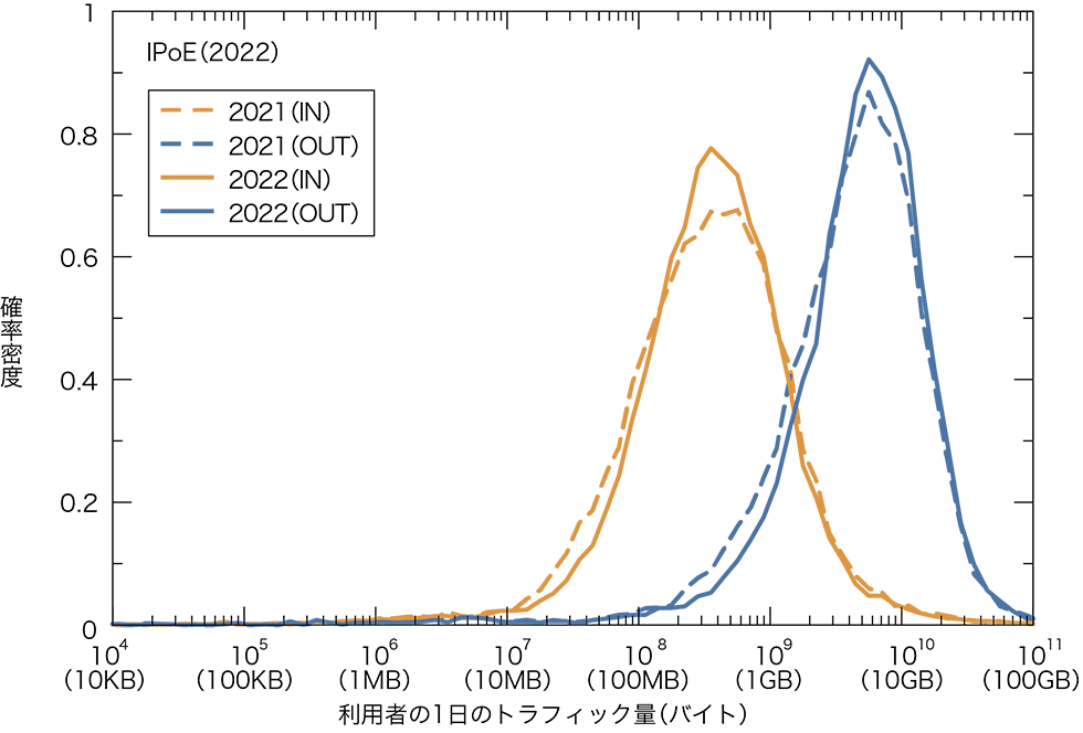 図-3、図-4及び図-5は、ブロードバンド(PPPoEとIPoE)とモバイル利用者の1日の平均利用量の分布(確率密度関数)を示します。アップロード(IN)とダウンロード(OUT)に分け、利用者のトラフィック量をX軸に、その出現確率をY軸に示していて、2021年と2022年を比較しています。X軸はログスケールで、10KB(104)から100GB(1011)の範囲を示しています。一部の利用者はグラフの範囲外にありますが、おおむね100GB(1011)までの範囲に分布しています。