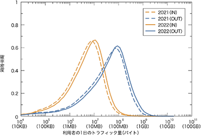 表-1は、ブロードバンド(PPPoE)利用者の1日のトラフィック量の平均値と中間値、分布の山の頂点にある最頻出値の推移を示します。分布の山に対して頂点が少しずれている場合は、最頻出値は分布の山の中央に来るように補正しています。分布の最頻出値を2021年と2022年で比較すると、INでは200MBから178MBに減っていて、OUTでは3981MBで変わりません。伸び率で見ると、INで0.9倍、OUTは1倍となっています。一方、平均値はグラフ右側のヘビーユーザの使用量に左右されるため、2022年には、INの平均は698MB、OUTの平均は4291MB と、最頻出値より大きな値になります。2021年には、それぞれ684MBと4225MBでした。
