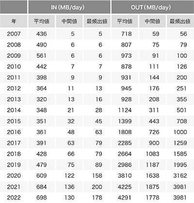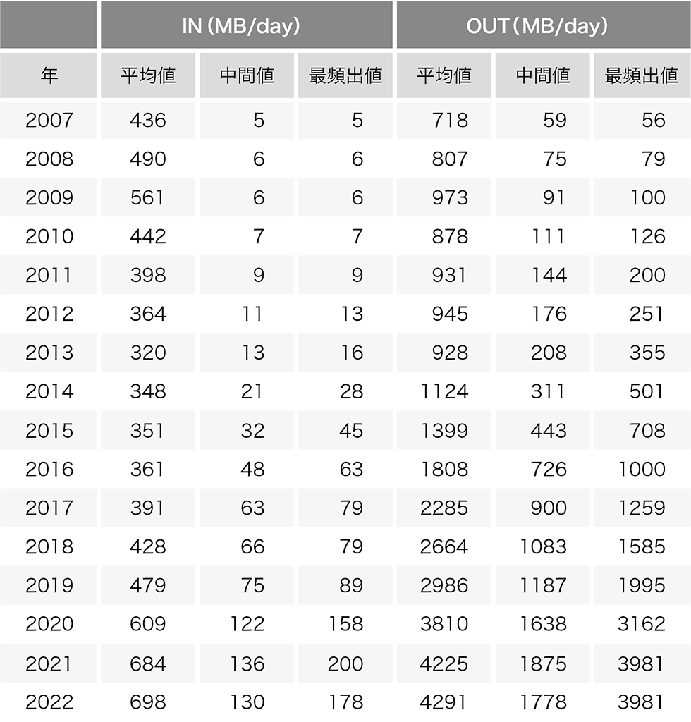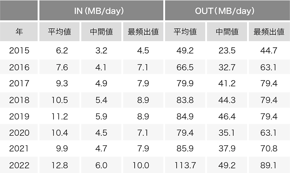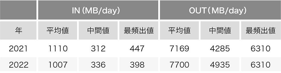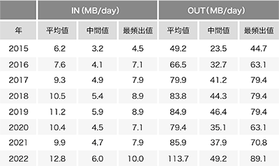 モバイルでは、表-3に示すように、すべての項目で増加しています。2022年の最頻出値はINで10MB、OUTで89MB、平均値はINで13MB、OUTで114MBです。2021年の最頻出値はINで8MB、OUTで71MB、平均値はINで10MB、OUTで86MBでした。