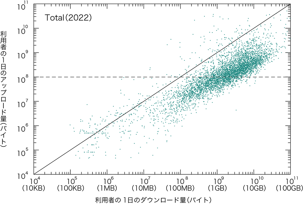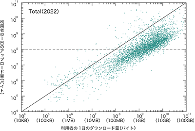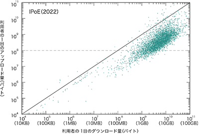 対角線の下側に対角線に沿って広がるクラスタは、ダウンロード量がひと桁多い一般的なユーザです。ブロードバンド(PPPoE)では、以前は右上の対角線上あたりを中心に薄く広がるヘビーユーザのクラスタがはっきり分かりましたが、今では識別ができなくなっています。また、各利用者の使用量やIN/OUT比率にも大きなばらつきがあり、多様な利用形態が存在することがうかがえます。IPoEでは、PPPoEに比べ利用者間のばらつきが少なく、利用量の少ないユーザ割合も小さいことが確認できます。モバイルでも、OUTがひと桁多い傾向は同じですが、ブロードバンドに比べて利用量は大幅に少なくなっています。ブロードバンド、モバイル共に、2021年との違いはほとんど分かりません。