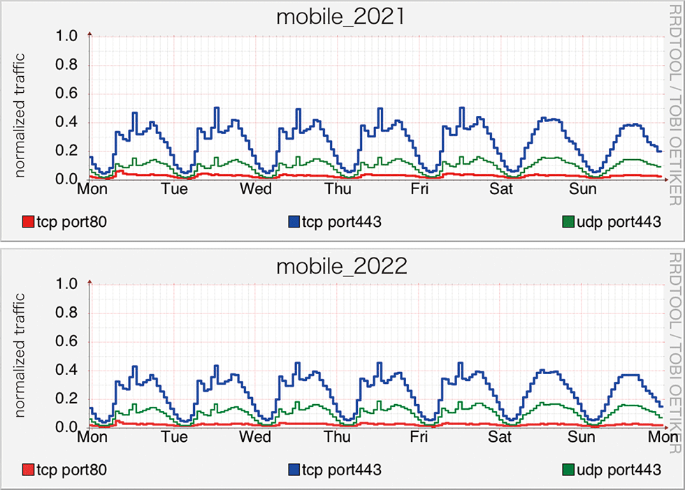 図-10のモバイルでは、トラフィックの大半を占めるTCP80番ポートと443番ポート、UDP443番ポートについて推移を示します。ここでも、2021年からの変化はほとんど見当たりません。ブロードバンドに比べると、朝から夜中までトラフィックの高い状態が続きます。平日には、朝の通勤時間、昼休み、夕方17時頃~22時頃にかけての3つのピークがあり、ブロードバンドとは利用時間の違いがあることが分かります。