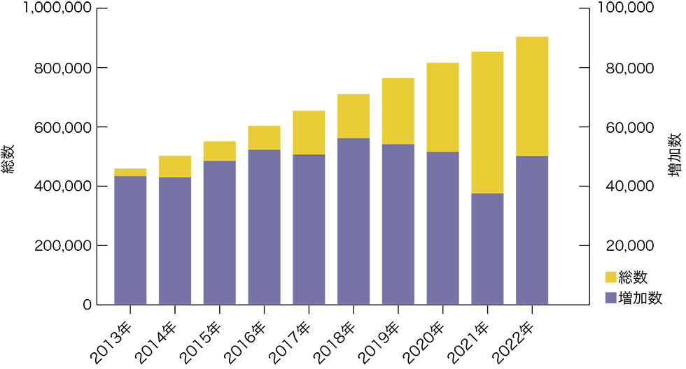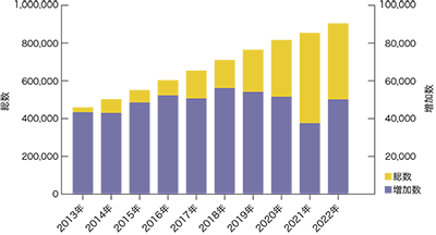 図-1「IPv4フルルート」経路の総数及び年間増加数の推移