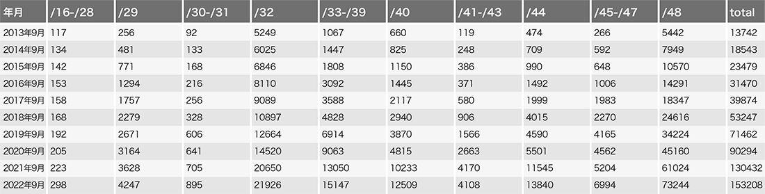 表-1「IPv4フルルート」に含まれるプレフィクス長ごとの経路数の推移