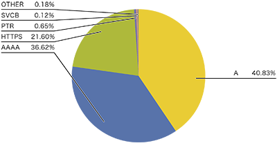 問い合わせレコードタイプに注目すると、ホスト名に対応するIPv4アドレスを問い合わせるAレコードとIPv6アドレスを問い合わせるAAAAレコードが全体の約8割を占めています。AとAAAAの問い合わせ傾向は通信に利用されるIPプロトコルで違いが見られ、IPv6での問い合わせではより多くのAAAAレコード問い合わせが見られます。IPv4での問い合わせでは、全体の60%程度がAレコード問い合わせ、20%程度がAAAAレコード問い合わせです(図-2)。一方IPv6での問い合わせでは、全体の40%程度がAレコード問い合わせ、36%程度がAAAAレコード問い合わせとAAAAレコード問い合わせの比率が高まっています(図-3)。昨年と比べるとIPv4、IPv6共に4ポイント程度Aレコードの問い合わせが減少しています。