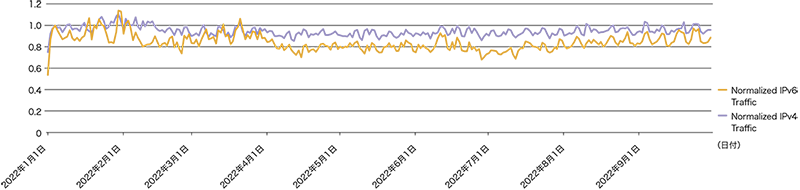 昨年同様に仕事初めの2022年1月4日を1とした推移をグラフ化したものが図-5となります。IPv6、IPv4共に横ばいというより若干の減少が見て取れます。