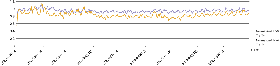 2022年はIPv6もIPv4も総じてトラフィックは横ばいとなりました。これまではIPv4でも数%、IPv6の場合は十数%の伸びを示していたので、横ばいとなるのはかなり珍しいように思います。ここ数年を振り返ると、2020年はコロナ影響による若干の停滞、2021年は反動による大きな増加となっていたため、今年は目立った傾向が出ていない状況なのかもしれません。