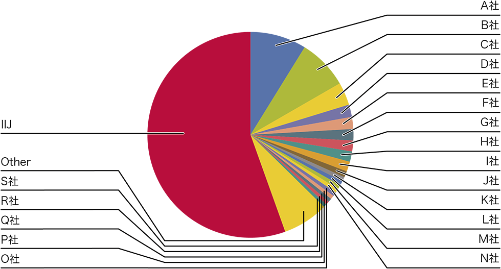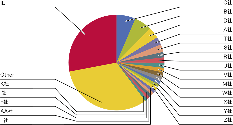 前回の本レポートVol.53(https://www.iij.ad.jp/dev/report/iir/053.html)で、日本の大手コンテンツ事業者であるA社がIPv6トラフィックの2位になったことを報告しましたが、今年はその事業者が占有率8.8%で1位となりました。2位は昨年まで連続して1位だったB社で7.9%、3位は昨年同様米国大手CDN事業者のC社で3.6%となっています。また、日本の大手コンテンツ事業者であるG社も1.7%+0.6%(事業別にASを複数所有している)で上位に食い込んできており、徐々に日本のコンテンツ事業者もIPv6への対応を進めていることがうかがえます。