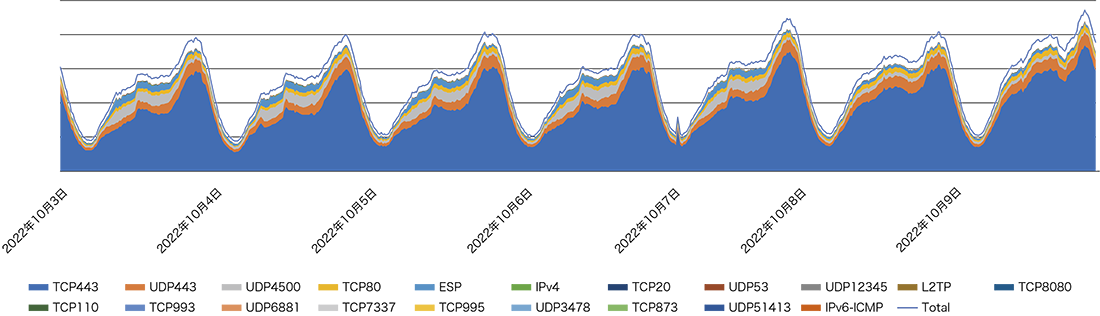 IPv6では、昨年3位だったESP(IPSec)が5位に後退し、昨年5位だったUDP4500(NAT Traversal IPSec)が3位となり、逆転した形となりました。IPv6でNATは基本的には使いませんが、NAT-Tのポートを使うのは実装を共通化する意図があるのでしょうか。なお、土日昼間はIPv6トラフィックも平日と比べ伸びていますが、ESPやUDP4500はかなり減っており、主にリモートワークなどの業務に利用されていることが想像できます。