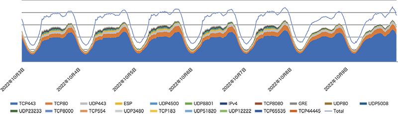 IPv6トラフィックのProtocol番号(Next-Header)と送信元ポート番号で解析したグラフを図-9に、IPv4トラフィックのProtocol番号と送信元ポート番号のグラフを図-10に示します。期間は2022年10月3日(月)から10月9日(日)までの1週間です。