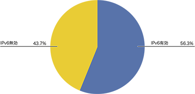 まずIPv6が有効化されている接続の割合は図-11のとおり、IPv6有効な接続が過半数(56.3%)となりました。また、グラフは掲示していませんがトラフィック比率については、7(IPv4):3(IPv6)となりました(平日18時頃の比較的トラフィックの多い時間帯)。接続数・トラフィック共にIPv6が大きく伸びたと言えるのではないでしょうか。