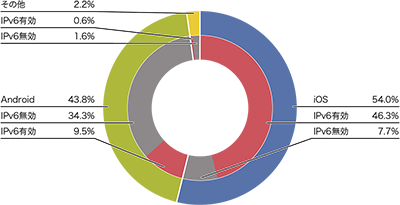 次にモバイルOS別のIPv6接続状況を見てみます。図-12の円グラフは、IIJmioモバイルサービスに接続していた端末の種別をIMEIの一部(TAC:先頭8桁)から、GSMAのデータベースの情報と突合して、Apple iOS(iPhoneやiPad)、Android、その他(モバイルルータやドングルなど)の3種類に分類し、IPv6接続状況を調査したものです。