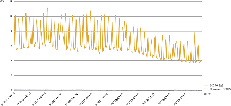 全体トラフィックにおける3G(図-13)の割合は下記のとおりです。コンシューマ向けサービスにおいては平均で全体トラフィックの0.05%程度しか3G通信はなく、ほぼゼロに等しい状況になっています。法人向けサービスにおいて平均で6.4%が3G通信として使われている状況です。傾向を見ると、2022年4月ごろまでは微減という状況で大きな変動なく推移していますが、2022年5月以降になると減少傾向が加速しているように見えます。