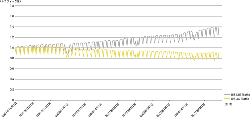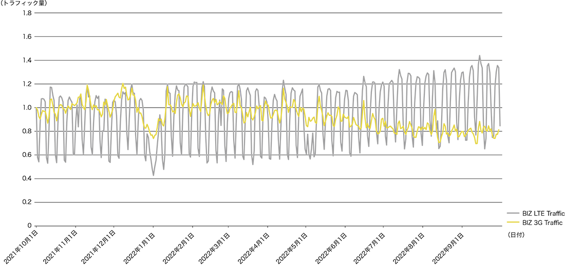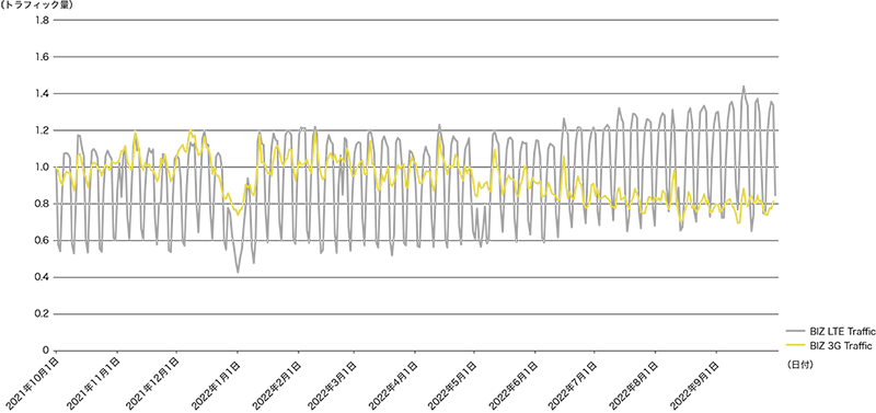 法人向けサービスにおいてはトラフィック傾向がお客様の3GからLTEへの移行計画の進捗に左右されることになります。モバイル設備担当としては、終了が見えている3G通信が減り、LTE通信が増加していくのは喜ばしいことですので、引き続き安定的な設備を提供しながら3G通信の減少を見守りたいと思っています。