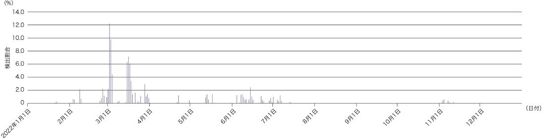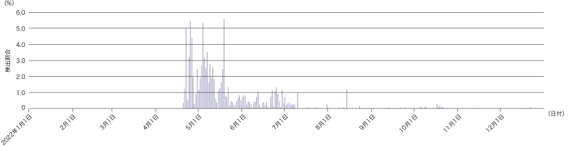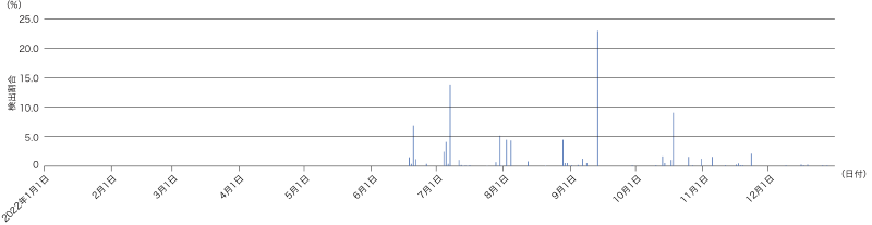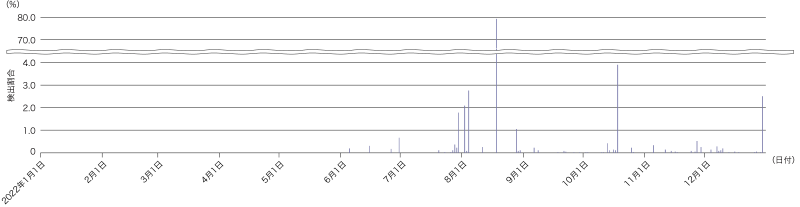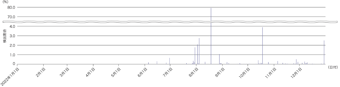 図-1では1年間におけるEmotetのメール件数の推移を示します。図の横軸は日付を、縦軸は対象期間における合計検出数を100%として正規化した割合を表します。