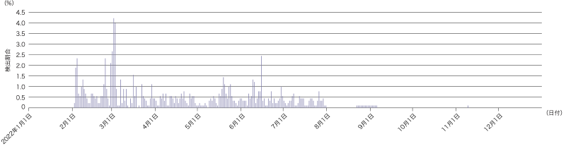 続いて、1年間におけるEmotetに感染した端末の割合を図-2に示します。図の横軸は日付を、縦軸は対象期間におけるEmotetの感染端末数の合計を100%として正規化した割合を表します。なお、感染端末数はC&Cサーバへ通信を行うIPアドレスを1端末として集計しています。