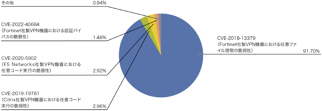 検知数が全体の91.70%を占め最も多かったのは、CVE-2018-13379でした。この脆弱性を悪用することで、攻撃者はVPN接続に必要な認証情報を窃取することができます。公表から既に3年以上が経過しているものの、今なお多くの攻撃が行われているだけでなく、実被害も発生しています。2021年10月にランサムウェア攻撃を受けた医療機関は、2022年6月に公表された報告書(注11)で、侵入の契機として当該脆弱性が悪用された可能性が高いと述べています。また、インシデントカレンダー(表-1、表-2)の10月に示すランサムウェア攻撃を受けた医療機関についても、侵入のきっかけとなった可能性が高いとされる取引業者のVPN機器で、当該脆弱性が残存するバージョンのOSが用いられていたことが示されています(注12)。