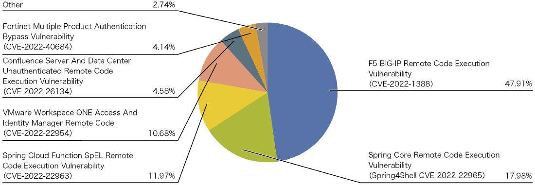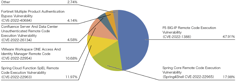 CVE-2022-40684は、2022年10月に公表された比較的新しい脆弱性です。この脆弱性を悪用することで、攻撃者は認証を回避して当該VPN機器の管理画面にアクセスができることから、設定変更などにより組織内ネットワーク侵入への足掛かりとなる恐れがあります。図-4に示すとおり2022年1年間を通した検知数は1.48%であり第4位となりましたが、そのほとんどは2022年12月21日~31日のわずか11日間に検知されたものでした。2023年以降も攻撃が継続する可能性もあることから、引き続きの警戒が必要です。