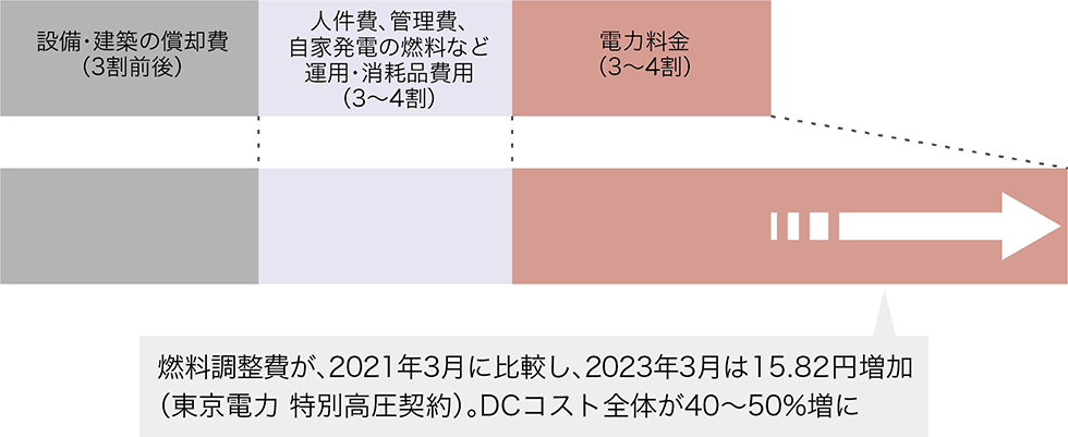 一般的にデータセンターの運営コストに占める電力料金の比率は3~4割と言われています(図-1)。2021年3月と2023年1月との比較では燃料調整費が15.82円/kwh(東京電力 特別高圧)上昇しており、DC全体のコストが40~50%増えたことになります。省エネをはじめとした企業努力は継続しますが、お客様にご負担いただくことが避けられない状況になっています。
