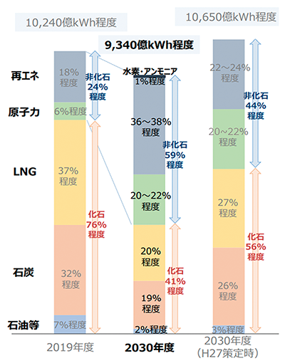 気候変動問題に関する国際的な枠組み「パリ協定」の目標でもある「温室効果ガス(CO2、メタン、N2O、フロン)の排出量をゼロにするカーボンニュートラルを2050年までに達成する」ことを、世界120以上の国と地域が表明しており、日本政府も2020年10月、「2050年のカーボンニュートラル」を宣言しました。そして、政府は2022年12月「GX実現に向けた基本方針」を決定し、これにより「徹底した省エネルギーの推進」「再生可能エネルギーの主力電源化」「原子力の活用」「水素・アンモニアの導入」「電力・ガス市場の整備」「資源外交」「蓄電池産業」などの進め方や工程が明示され、今後それを実現するための法制度が整備されていくことになります。2021年10月の「第6次エネルギー基本計画」でも、図-2のとおり2030年のエネルギーミックスで9%程度の省エネと、従来22~24%だった再生可能エネルギー比率を36%~38%程度に増やすことが数値目標として示されています。IIJも需要家として、カーボンニュートラル実現に向けた省エネ・再エネを、主体的に取り組むべき課題と捉えています。